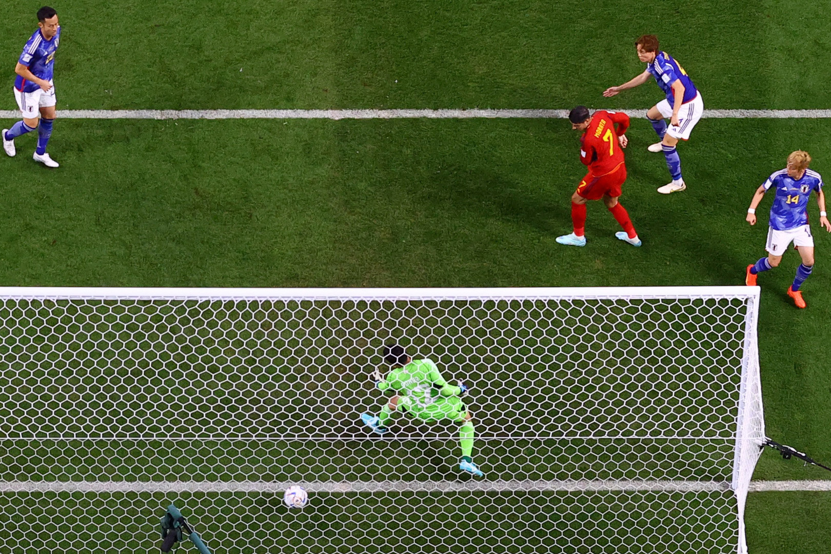 Lưới của Tây Ban Nha rung lên lần thứ hai, trọng tài từ chối bàn thắng khi cho rằng bóng đã đi hết biên ngang. Ritsu Doan sút chéo góc, Mitoma nỗ lực cứu bóng chỉ vài mm trên vạch biên ngang và Ao Tanaka dứt điểm cận thành vào khung thành trống.