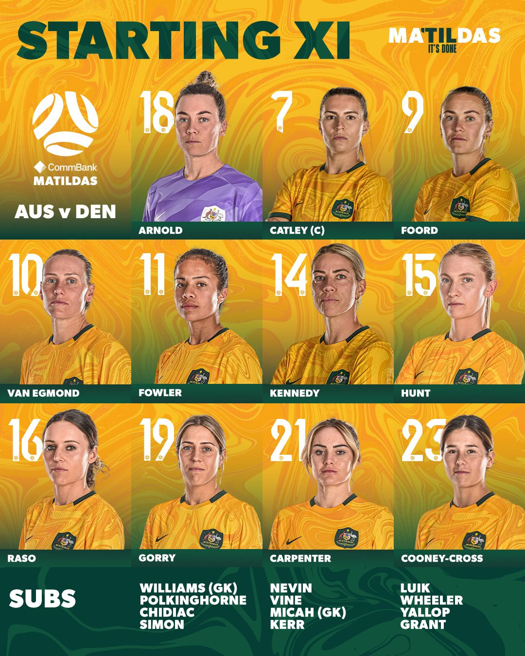 Nữ Australia: Arnold; Carpenter, Hunt, Kennedy, Catley; Gorry, Cooney-Cross; Raso, Foord, Van Egmond; Fowler.