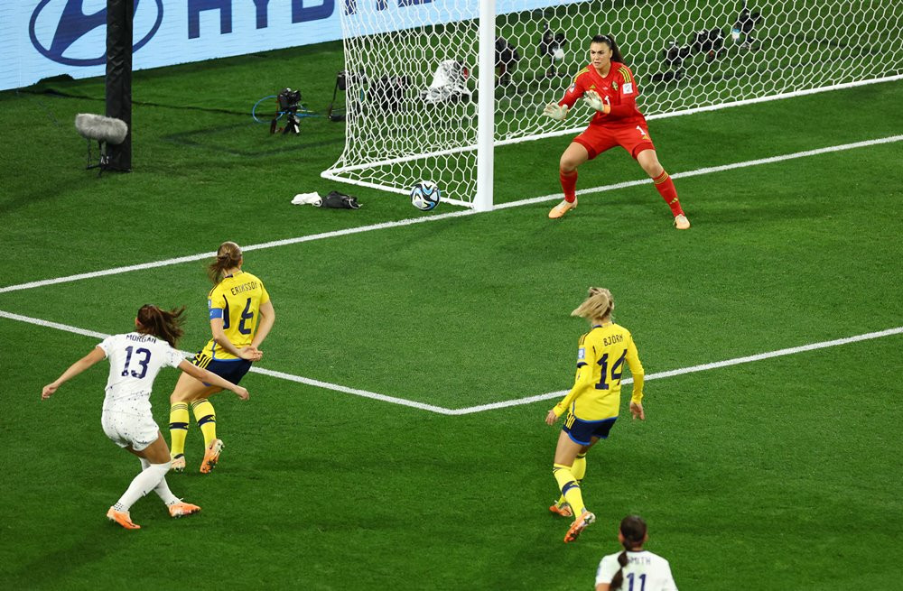 Tiền đạo kỳ cựu Alex Morgan xâm nhập vòng cấm rồi nỗ lực xoay người dứt điểm, tuy nhiên vẫn không thắng được thủ môn Thụy Điển.