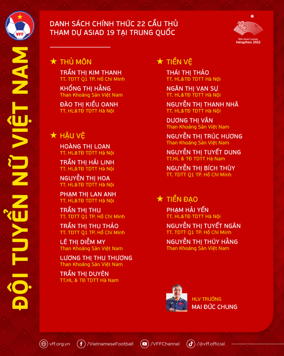 Cập nhật lịch thi đấu của tuyển nữ Việt Nam tại Asiad 19 diễn ra từ ngày 21/9 đến 6/10 tại Hàng Châu, Trung Quốc.