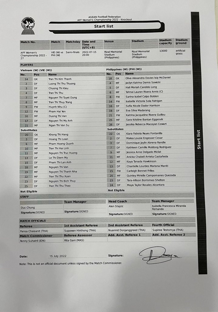 Trận đấu kết thúc với tỉ số 4-0 cho chủ nhà Philippines. Thầy trò HLV Mai Đức Chung chính thức trở thành cựu vô địch. ĐT nữ Việt Nam sẽ gặp ĐT Myanmar tại trận tranh hạng 3, lúc 15h ngày 17/7 trên SVĐ Rizal Memorial.