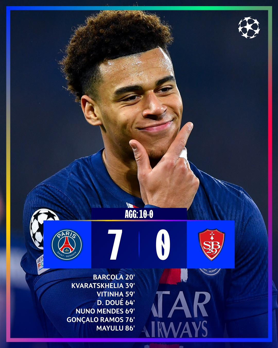 Ghi bàn: Barcola 20', Kvaratskhelia 39', Vitinha 59', Doue 64', Mendes 69', Goncalo Ramos 76’, Mayulu 86'