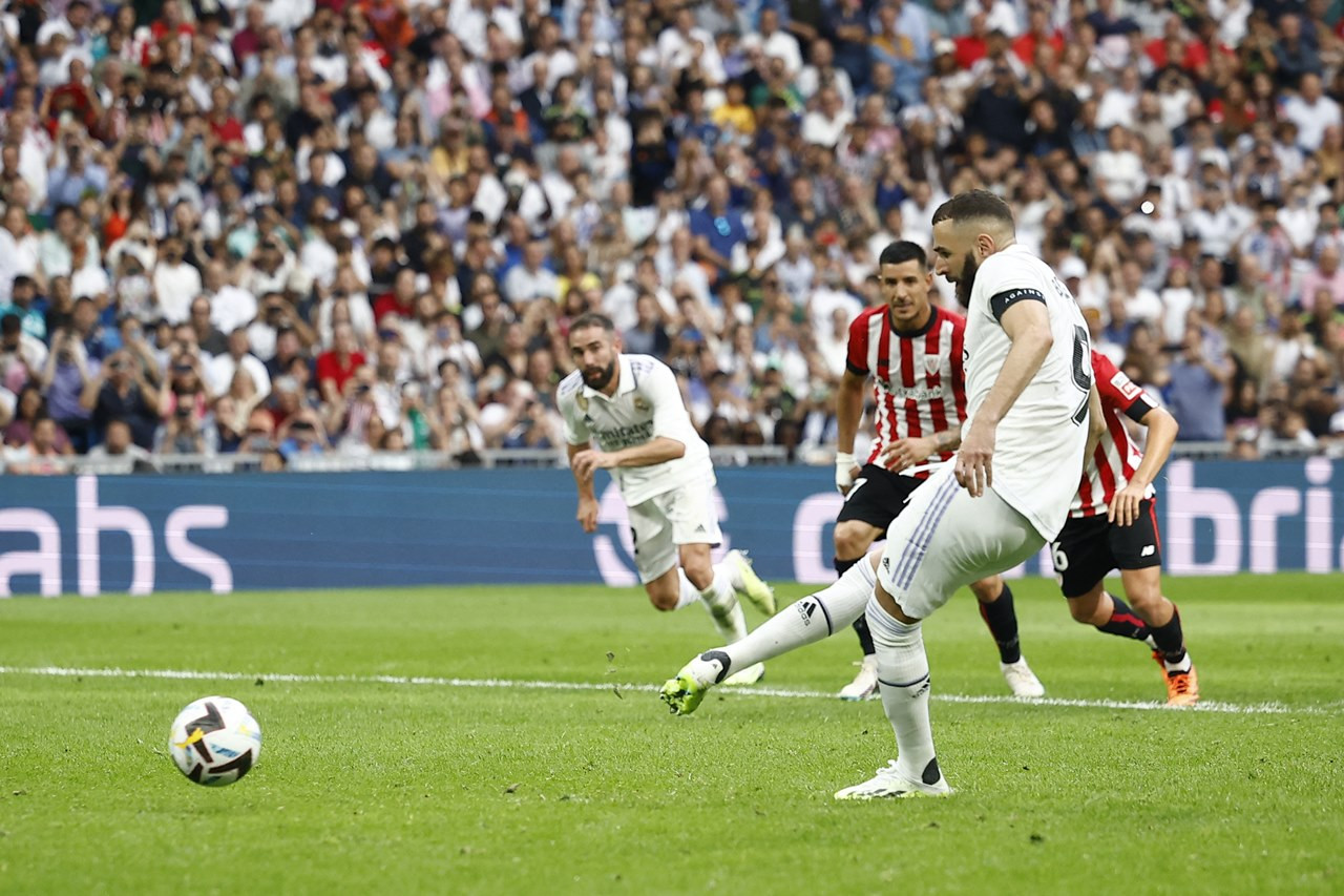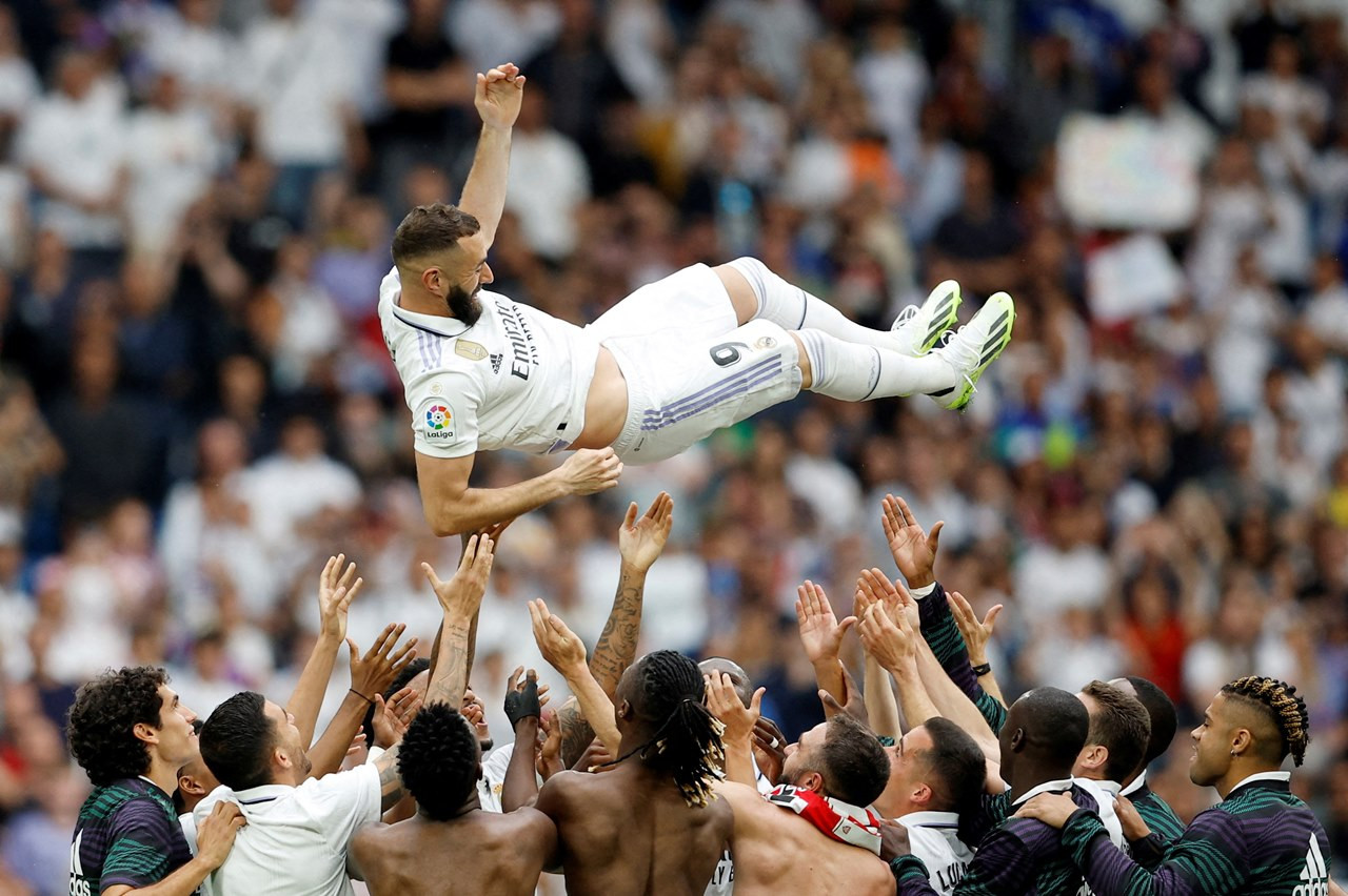 Đội hình của Real Madrid trận tiếp đón Athletic Bilbao, ở vòng cuối La Liga 2022/23Đội chủ sân Santiagio Bernabeu gặp không ít khó khăn trước các cầu thủ BilbaoNgay phút thứ 10 đội khách được hưởng phạt đền. Tuy nhiên M. Vesga không thắng được thủ môn Thibaut CourtoisVinicius trở lại đội hình của Real và gây ra không ít khó khăn cho cánh phải của BilbaoSau khi để Bilbao mở tỉ số ở phút 49, đến phút 72 Benzema sút phạt đền thành công, gỡ hòa 1-1 cho Los BlancosNiềm vui của Benzema với bàn thắng trong trận đấu cuối cùng tong màu áo "Kền kền trắng"Benzema gia nhập Real Madrid từ năm 2009, cùng thời điểm với Cristiano Ronaldo và sớm trở thành trụ cột của đội chủ sân Bernabeu. Trong 14 mùa giải, Benzema đã chơi 647 trận, ghi 353 bàn, đi kèm với đó là 25 danh hiệu, một kỷ lục tại Real Madrid, nổi bật là 5 chức vô địch Champions League, 4 lần đăng quang La Liga...Hai phút sau khi ghi bàn gỡ hòa 1-1, HLV Ancelotti rút Benzema ra để tung lão tướng Luka Modric vào sânTiền đạo người Pháp vỗ tay cảm ơn CĐV Real MadridAnh không kìm nén được những giọt nước mắt trước khi rời sânÔm người thầy Carlo AncelottiÔm chia tay các đồng đội sau trận đấu