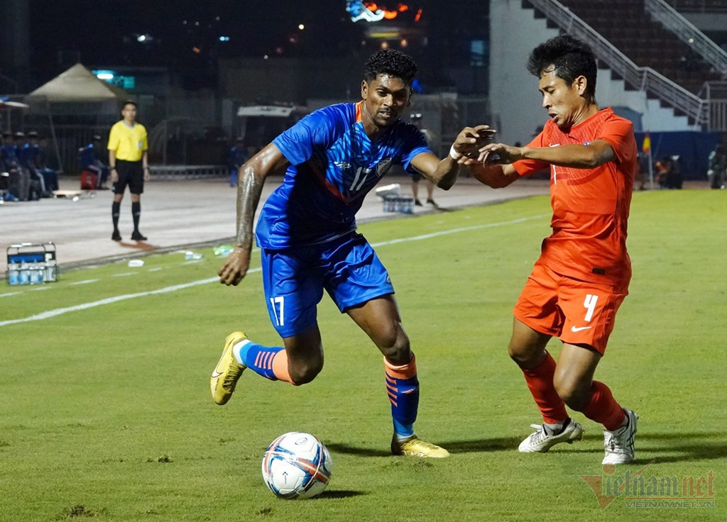 Các cầu thủ Ấn Độ đang chủ động đẩy cao đội hình chơi pressing ngay bên phần sân của Singapore.