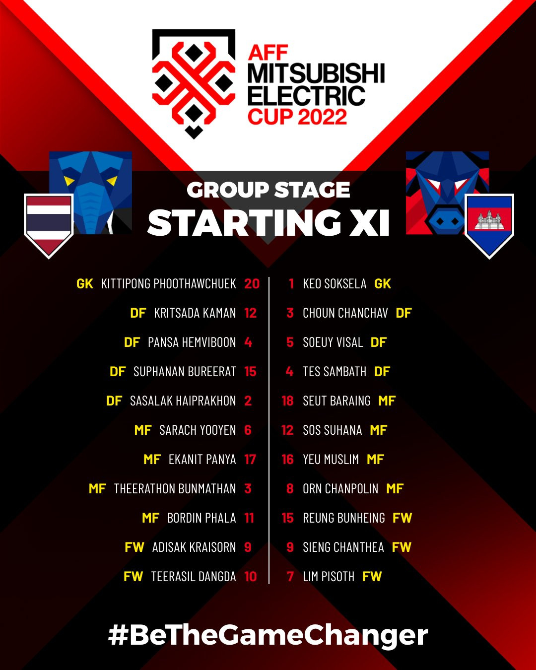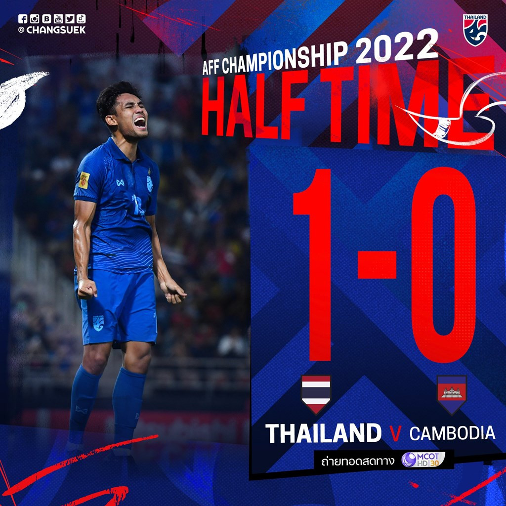 Thái Lan được hưởng phạt đền sau khi Sasalak Haiprakhon bị cầu thủ Campuchia phạm lỗi trong vòng cấm. Tiền đạo lão tướng Teerasil Dangda không bỏ lỡ cơ hội ghi bàn mở tỉ số trên chấm 11m.