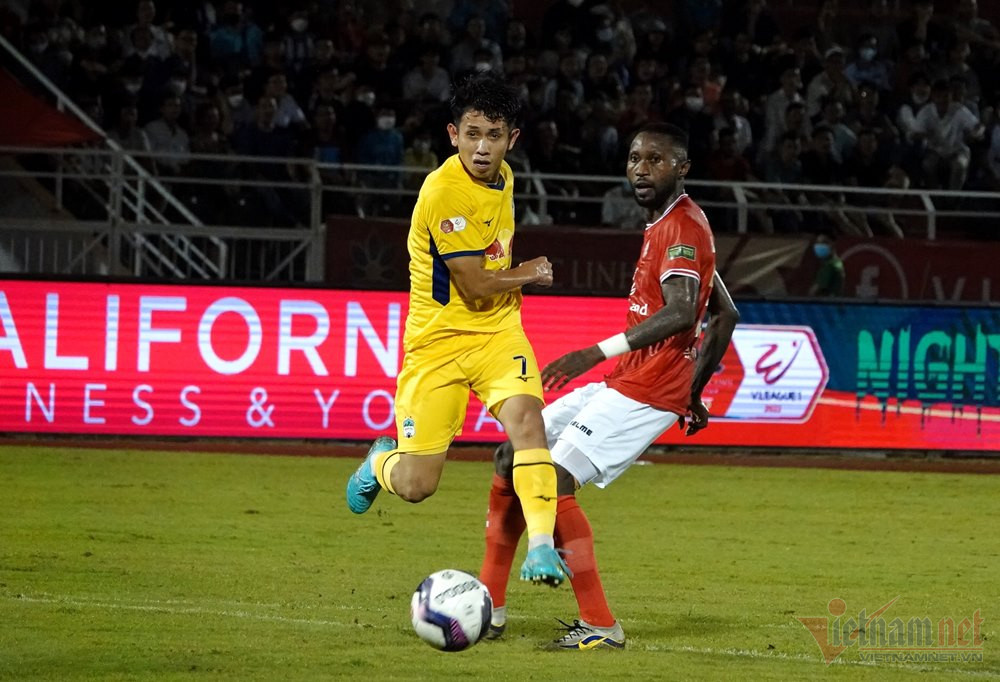 Văn Toàn đột phá xuốn đáy biên rồi tạt bổng vô tình đưa bóng dội xà ngang khung thành đội chủ nhà TP.HCM.