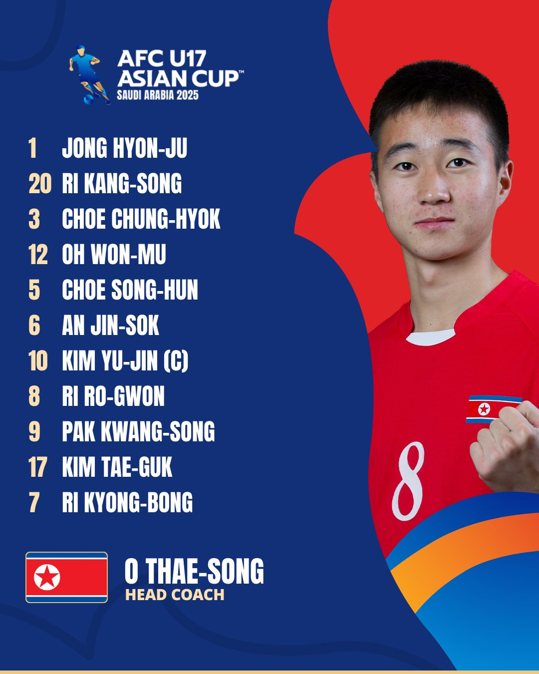 U17 Triều Tiên: Jong Hyon-Ju (GK), Choe Chung-hyok, Choe Song-hun, An Jin-sok, Ri Kyong-bong (Ri Kang-rim 50'), Ri Ro-gwon (Myong-bom Kang 50'), Pak Kwang-song, Kim Yu-jin, Oh Won-mu, Kim Tae-guk, Ri Kang-song.