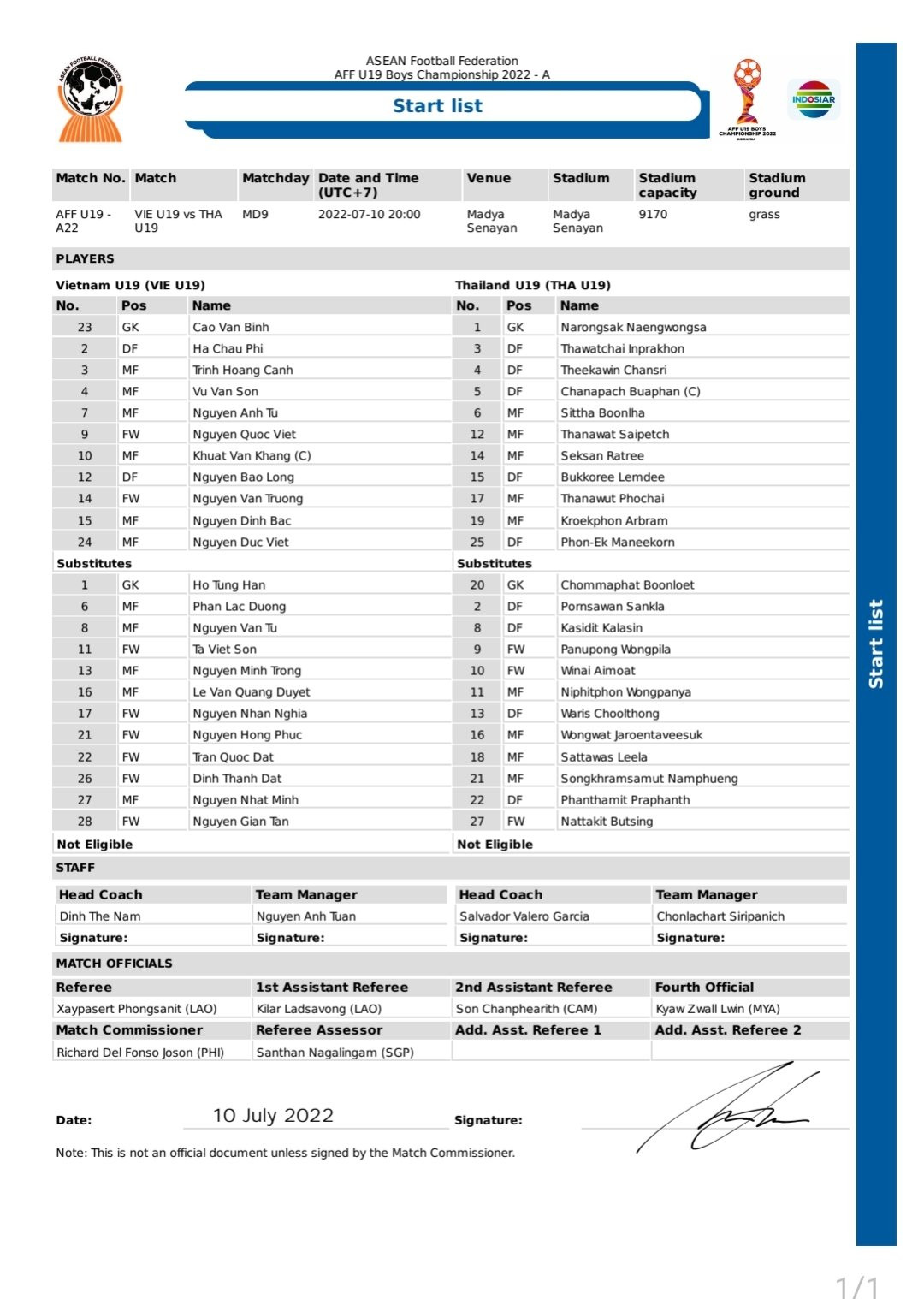 U19 Việt Nam: Văn Bình, Châu Phi, Văn Sơn, Hoàng Cảnh, Bảo Long, Anh Tú (Văn Tú 59'), Đức Việt, Văn Khang (Hồng Phúc 90'+3), Văn Trường (Nhân Nghĩa 85'), Đình Bắc (Viết Sơn 90'+3), Quốc Việt