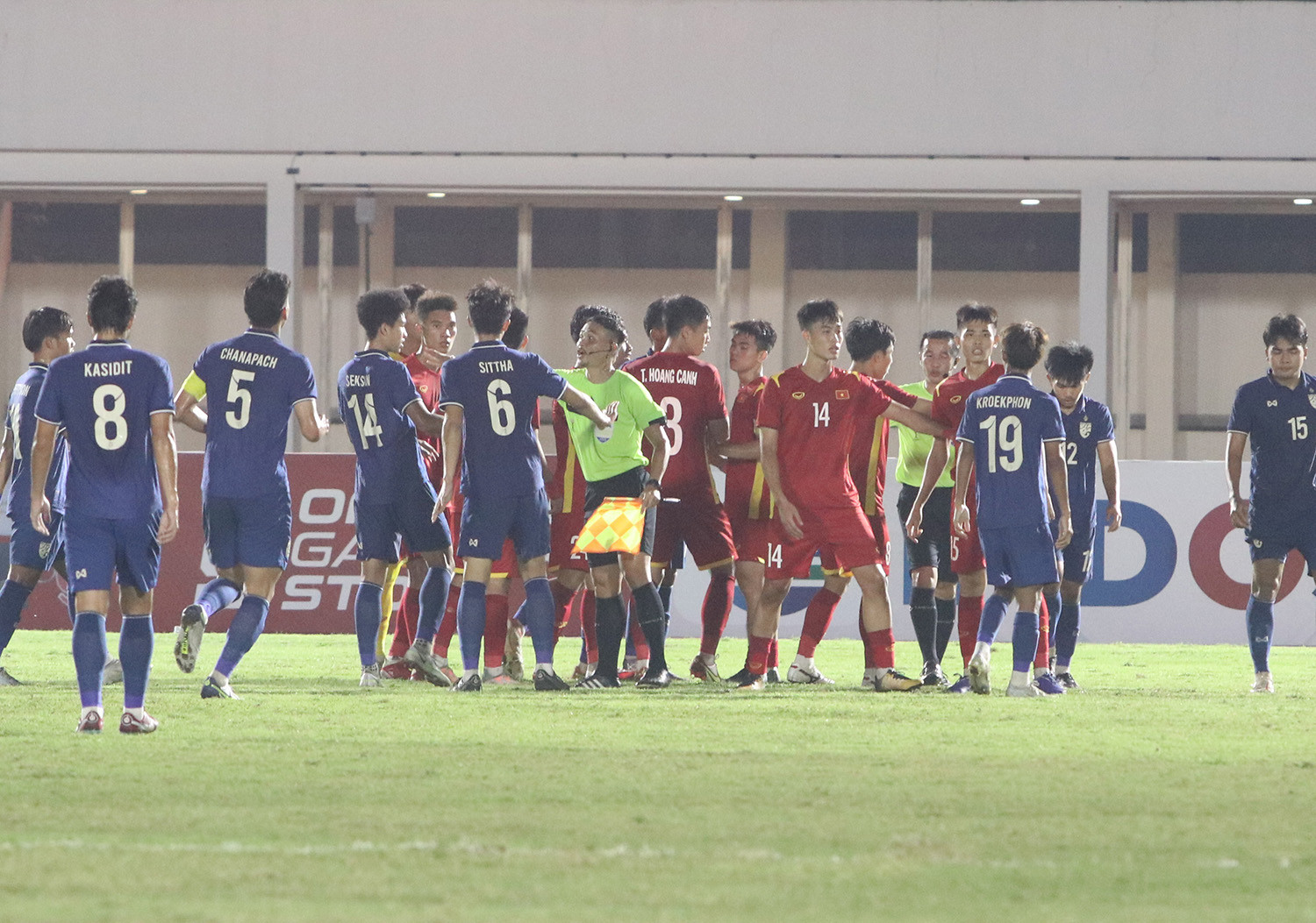 Trận đấu bị gián đoạn ít phút sau khi đội trưởng Văn Khang bị đau từ tình huống vào bóng quyết liệt của cầu thủ U19 Thái Lan.