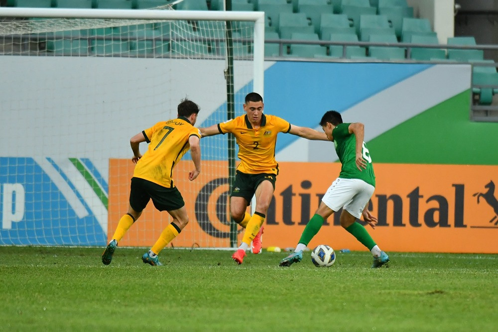 U23 Turkmenistan đang tổ chức phòng ngự kín kẽ khiến các cầu thủ U23 Australia chưa thể tiếp cận với khung thành của thủ môn Charyyev Rasul.