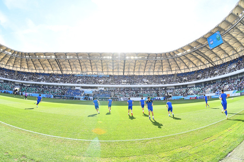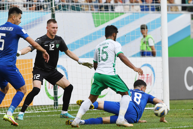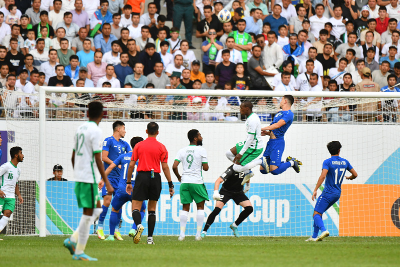Từ tình huống phạt góc bên cánh trái, Jyanov đá nối chân phải nhanh nhưng không đánh bại được thủ thành Nawaf.