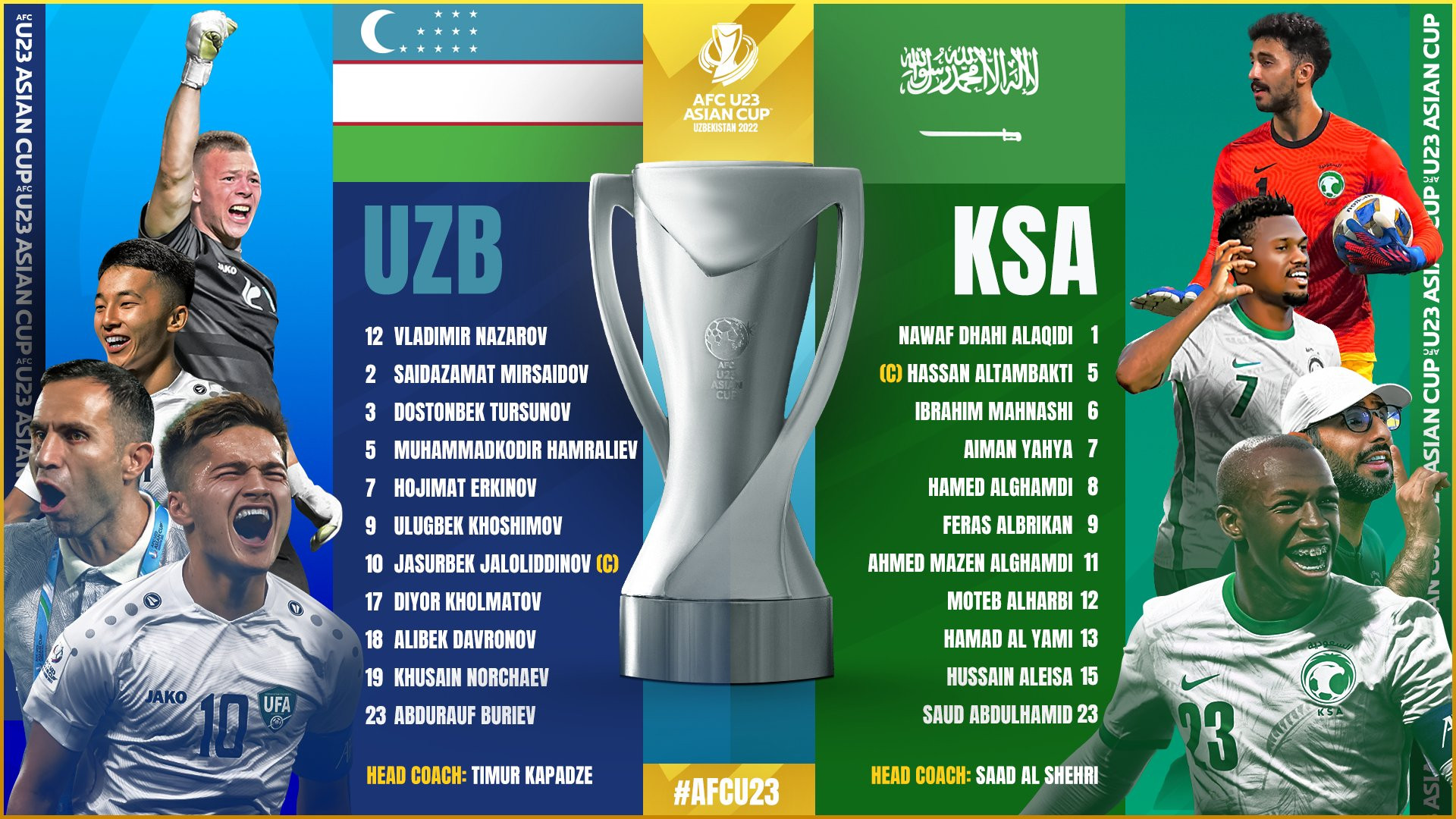 U23 Uzbekistan: Nazarov, Mirsaidov, Tursunov, Hamraliev, Jaloliddinov, Davronov, Buriev, Kholmatov, Erkinov, Norchaev, Khoshimov.