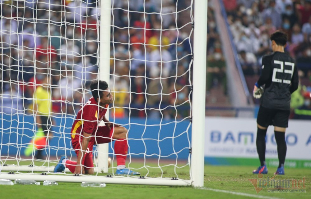Hồ Thanh Minh bỏ lỡ cơ hội ngon ăn khi không thể thể chạm được chân vào bóng từ đường chuyền ngon ăn của Văn Tùng.
