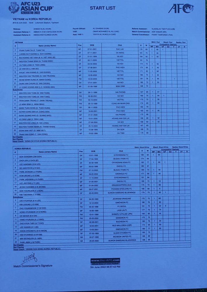 U23 Hàn Quốc: Goh Dong Min, Lee Jin Yong, Park Jae Hwain, Lee Sang Min, Kim Tae Hwan, Choi Jun (Lee Kyu-hyuk 81'), Eom Ji Sung (Cho Young-wook 46'), Goh Young Jun, Go Jae Hyeon (Hyeon-seok Hong 60'), Jeong Sang Bin (Oh Se-Hun 46'), Park Jeong In (Cho Hyun-taek 90')