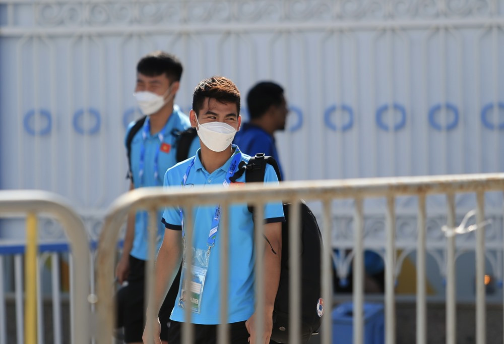 Thầy trò HLV Gong Oh Kyun đến sân chuẩn bị cho trân đấu.