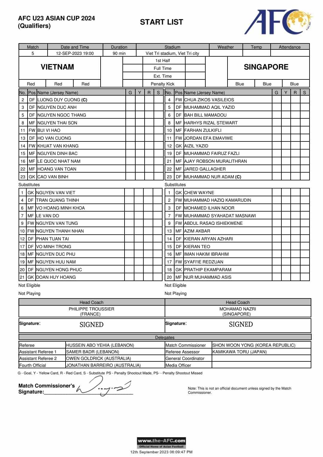 U23 Singapore: Aizil Yazid, Chua Vasileios, Muhammad Yazid, Bah Mamadou, Harhys Stewart, Farhan Zulkifli, Jordan Emaviwe, Muhammad Fazli, Ajay Muralithran, Jared Gallagher, Muhammad Adam.