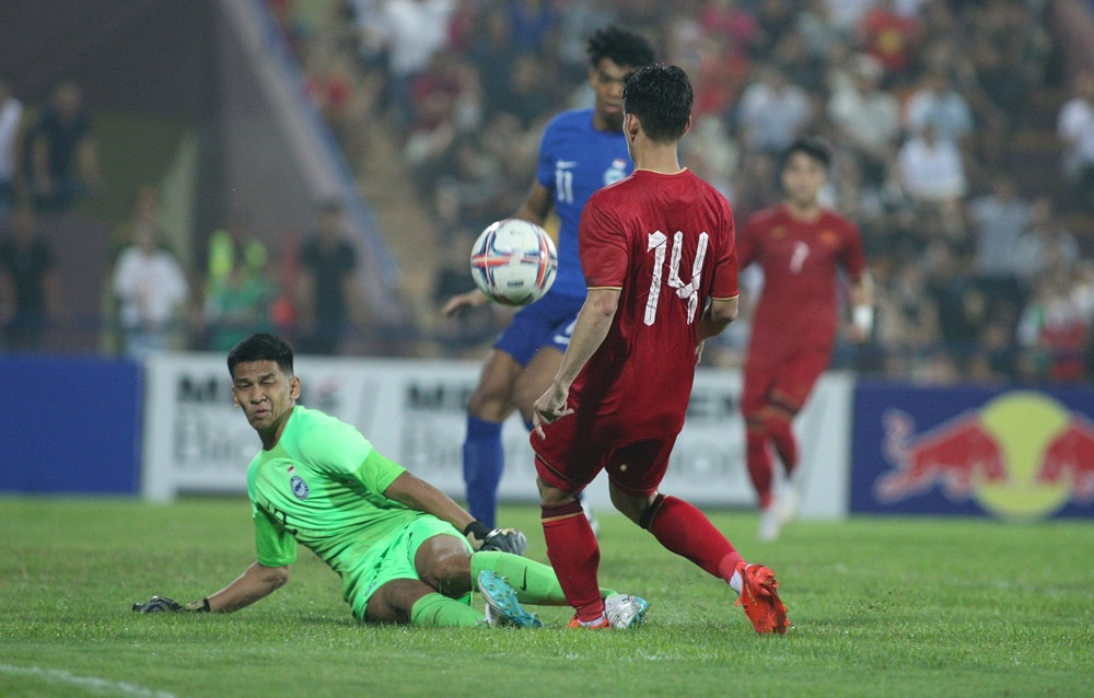 Không chỉ ép sân liên tục, các cầu thủ áo đỏ còn tổ chức đánh chặn từ xa kịp thời mỗi khi U23 Singapore có cơ hội phản công.