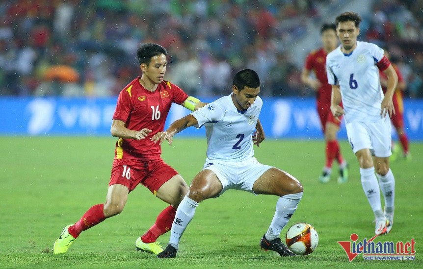 Các cầu thủ U23 Phillippines đang rất tích cực tranh cướp bóng và không ngại va chạm mỗi khi cần thiết. Đoàn quân của HLV Park Hang Seo gặp khá nhiều khó khăn dưới cơn mưa dày hạt trên sân Việt Trì, Phú Thọ.