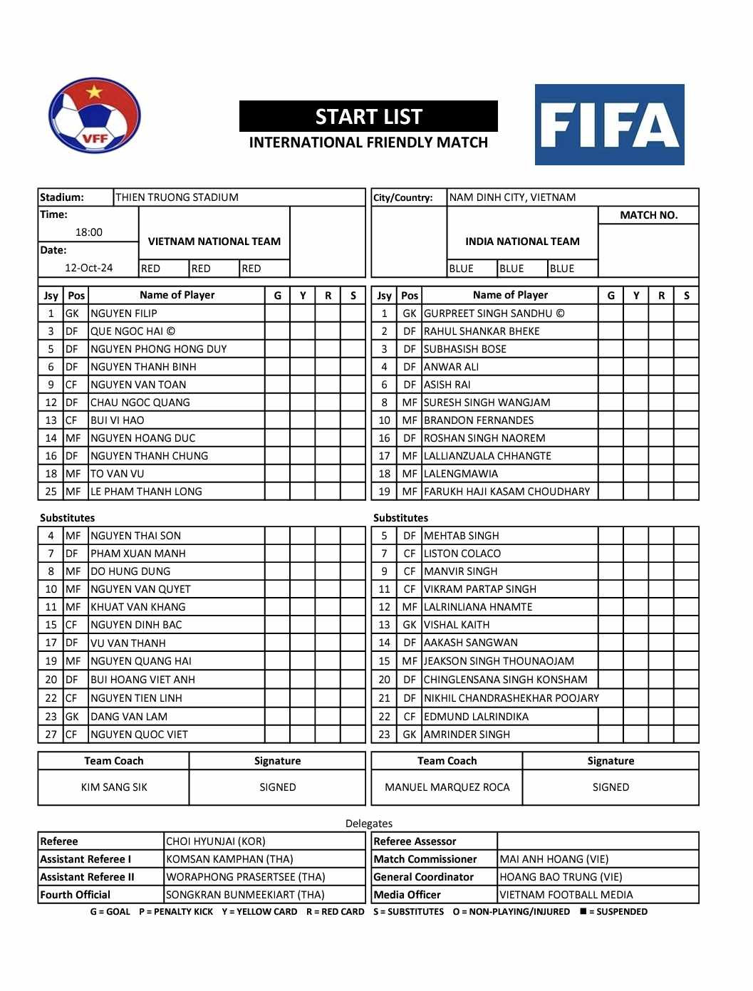 Danh sách thi đấu Việt Nam vs Ấn Độ. Ảnh: VFF