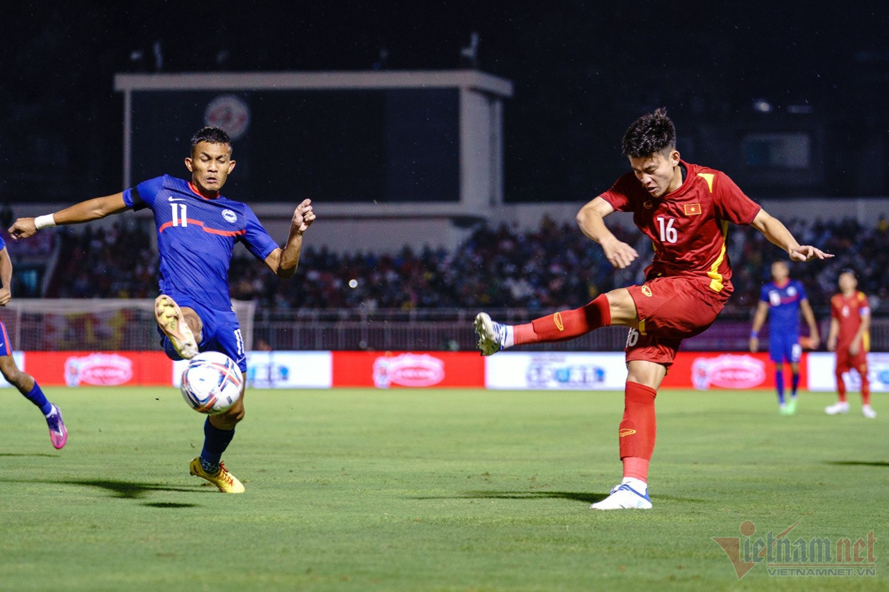 Khả năng đánh chặn tầm xa tốt của ĐT Việt Nam khiến các cầu thủ Singapore không có cơ hội vây hãm khung thành thủ môn Văn Lâm.