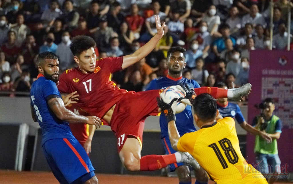 BÀN THẮNG! Việt Nam 4-0 Singapore (Khuất Văn Khang): Sau nỗ lực của Đình Duy từ cánh trái, đội trưởng Harun xử lý chậm chạp để cầu thủ vừa vào sân thay người Khuất Văn Khang tranh chấp quyết liệt nâng tỷ số lên 4-0.