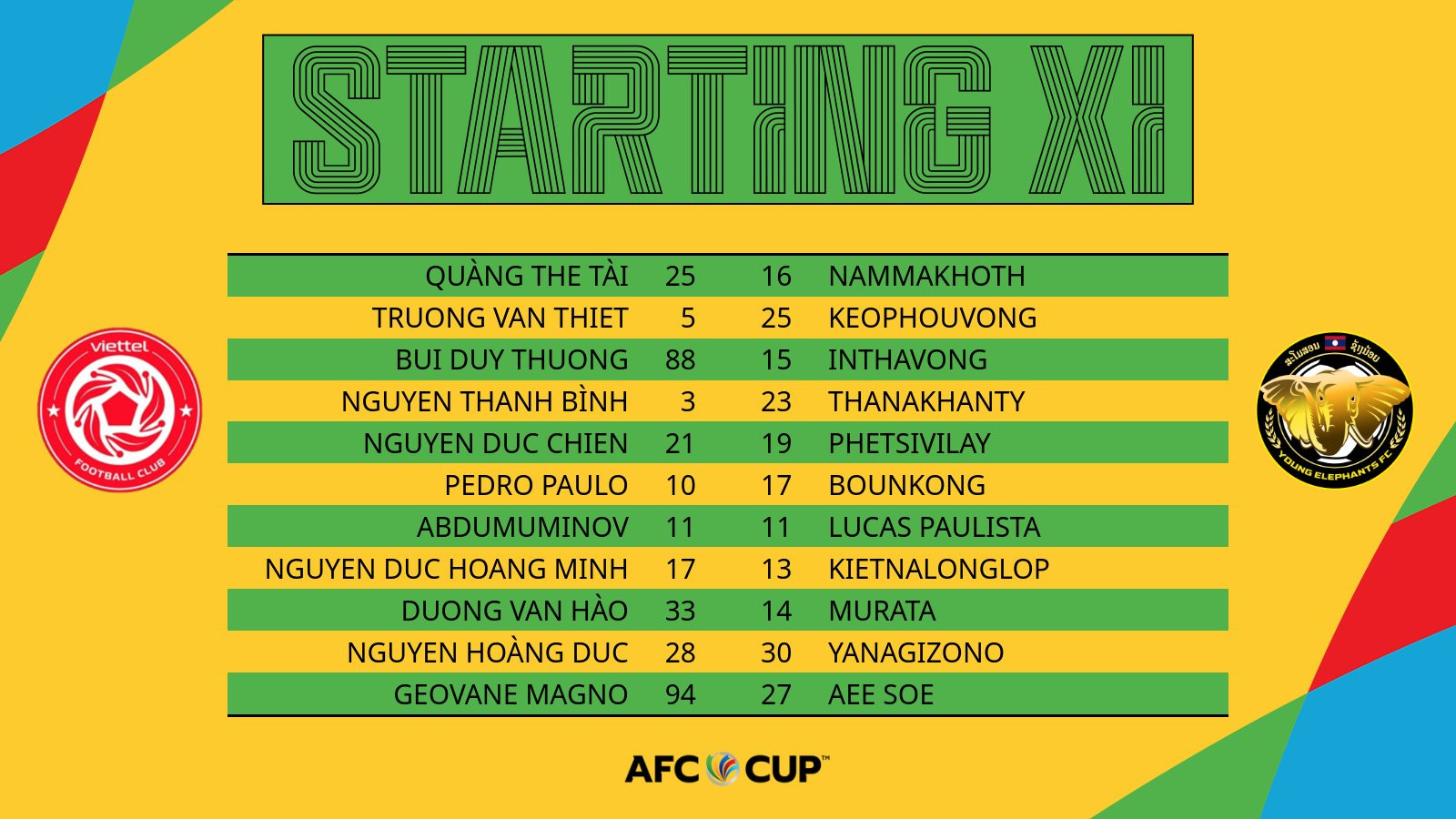 Lép vế trước Viettel nhưng Young Elephants bất ngờ vươn lên dẫn bàn. Lucas Da Silva tung cú sút, bóng đi không mạnh nhưng thủ môn Thế Tài mắc sai sót khi để bóng vuột khỏi tay, Bounphachan lao vào sút bồi tung lưới chủ nhà.