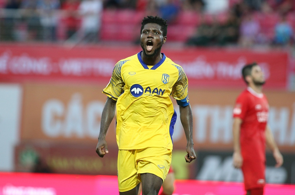 Sân Lạch Tray: Đón đường chuyền của đồng đội bên cánh phải, tiền đạo Olaha tung cú dứt điểm một chạm rất căng mở tỷ số cho SLNA.