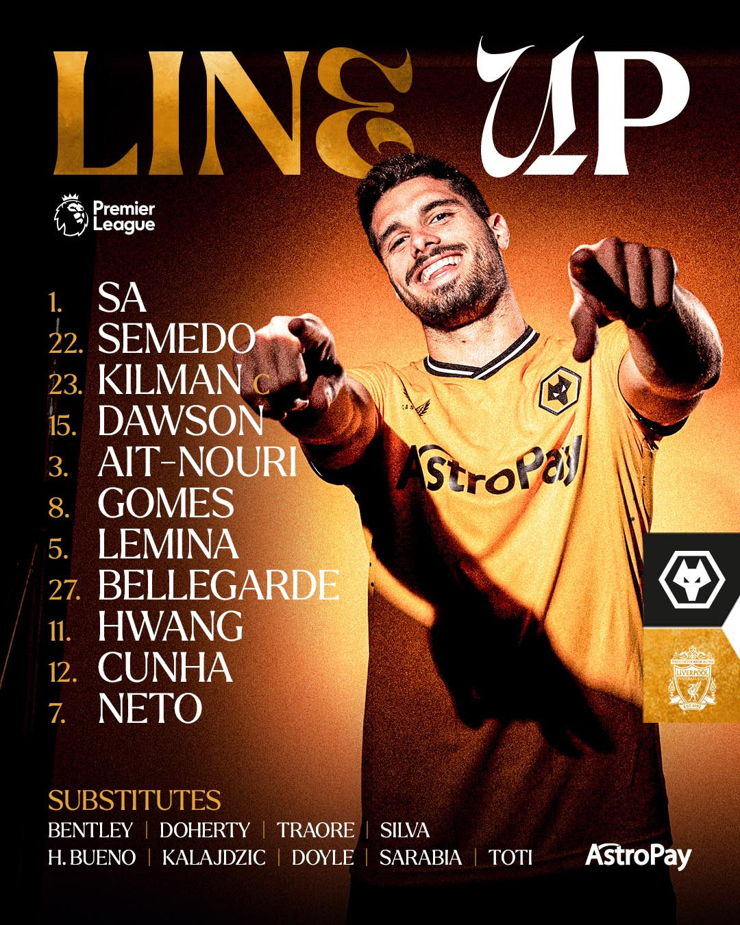 Wolves: Sa, Semedo, Dawson, Kilman, Ait-Nouri, Neto, Lemina, Gomes, Cunha, Bellegarde, Hwang Hee Chan.