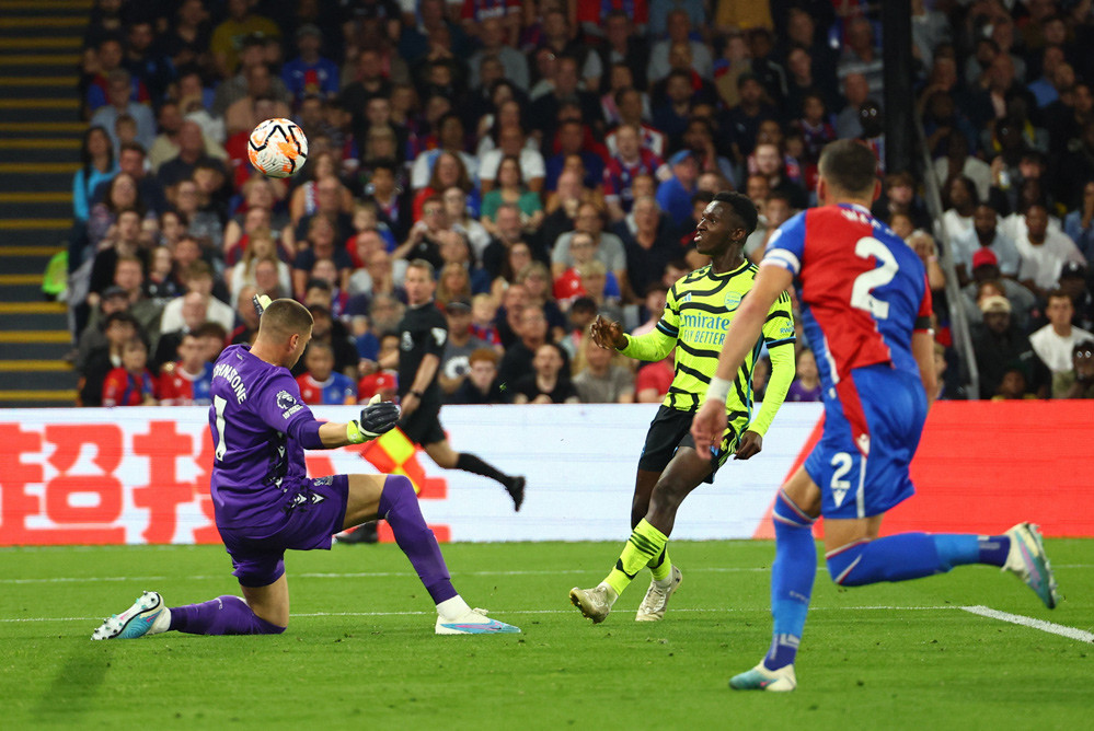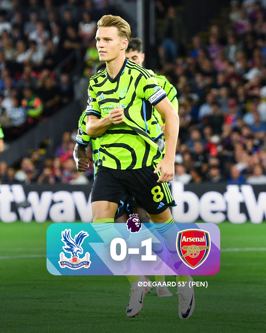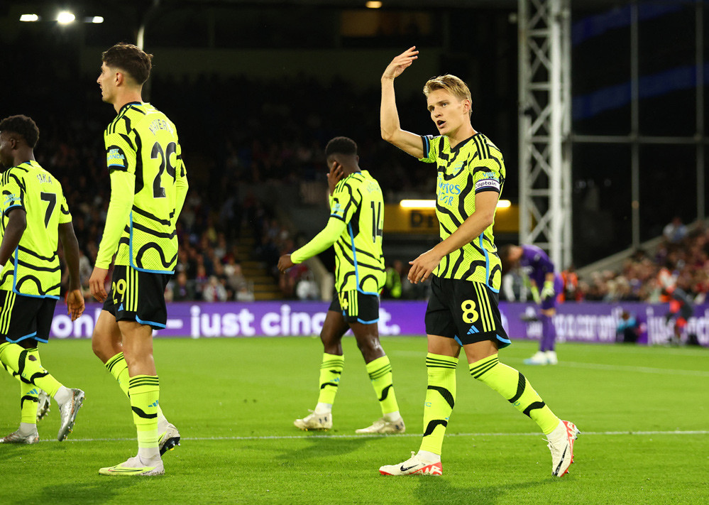Arsenal nhập cuộc khá tự tinRamsdale cản phá đường chuyền vào vòng cấm của đối phươngNketiah có cơ hội mở tỷ số nhưng sút chân trái trúng cột dọcTiếp đó, tiền đạo người Anh lốp bóng qua xà khá vô duyênSang hiệp hai, chính Nketiah mang về cho Pháo thủ quả phạt đềnĐội trưởng Odegaard không bỏ lỡ cơ hội trên chấm 11mNiềm vui của cầu thủ người Na UyĐồng đội chúc mừng OdegaardPhút 67, Tomiyasu nhận thẻ vàng thứ hai, đồng nghĩa thẻ đỏ rời sân sớmCrystal Palace bắt đầu đẩy mạnh tấn công tìm bàn gỡRamsdale hoạt động liên tục để bảo vệ mành lưới đội kháchArsenal thắng trận thứ 2 liên tiếp từ đầu giảiThầy trò Mikel Arteta ăn mừng sau trận