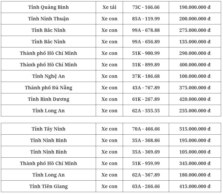 Tương tự, ca đấu giá từ 9h30 đến 10h30 đã khép lại với giá trúng lên tới 900 triệu đồng, thuộc về biển số 51K - 922.22 của TP.HCM. Một biển số khác là 51K - 858.88 ở mức 850 triệu đồng. Hai biển số xe tải: 99C - 266.66 của Bắc Ninh và biển xe ô tô con 85A - 118.88 thuộc Ninh Thuận có giá thấp 85 triệu đồng, còn lại các biển đều có gia dao động từ 110-550 triệu đồng. Không có biển nào giá 40 triệu và "0 đồng.