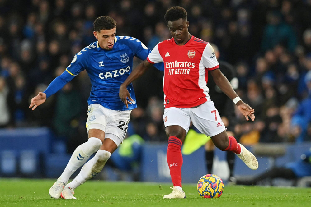 Bukayo Saka bị đau vùng mắt sau tình huống va chạm với Gueye.