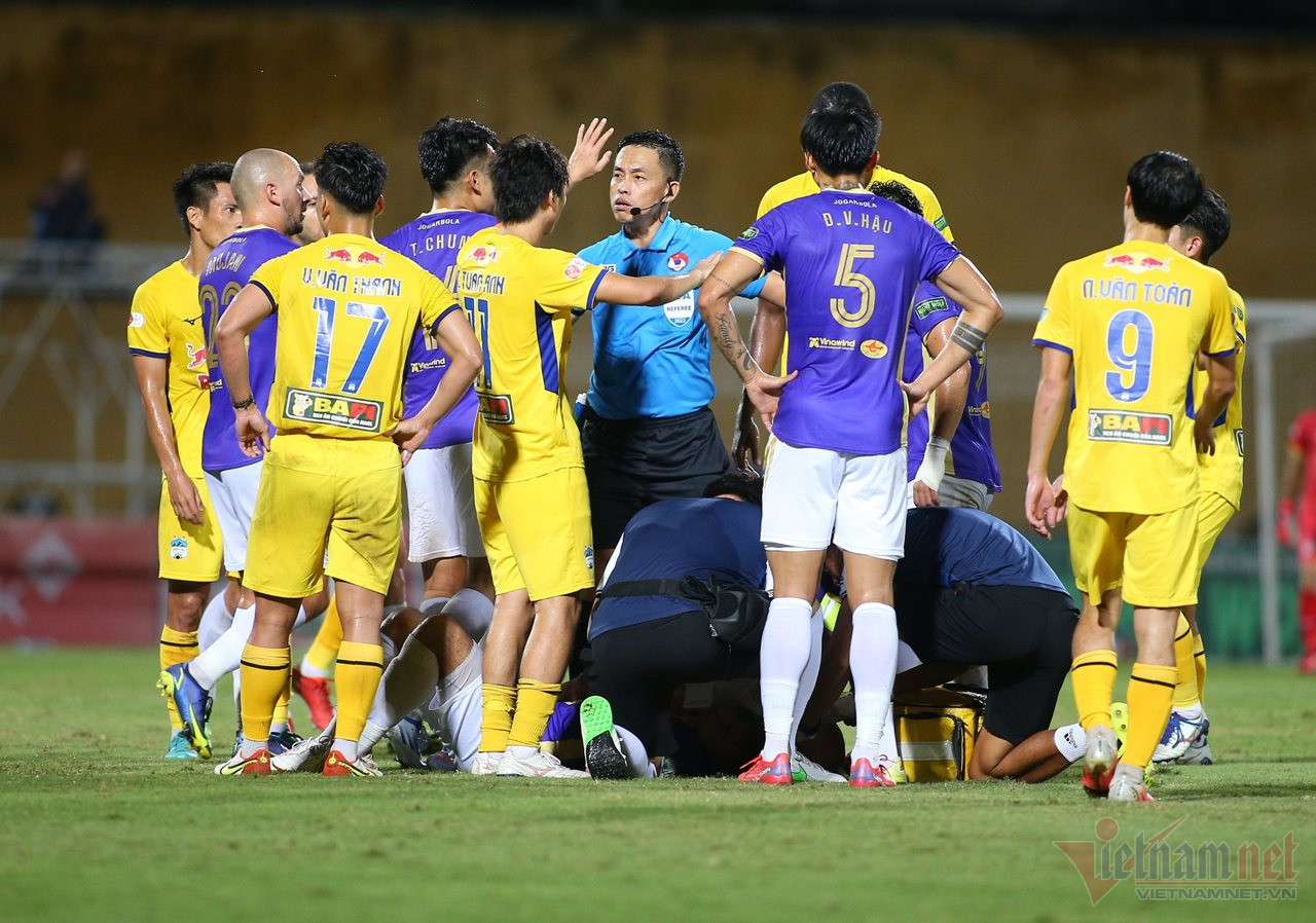 Trọng tài Ngô Duy Lân cho tạm dừng trận đấu và yêu cầu các nhân viên y tế vào sân để chăm sóc cho Đức Huy bị chảy khá nhiều máu trên vùng đầu. Tiền vệ của Hà Nội trước đó va chạm bằng đầu rất mạnh với đồng đội Tuấn Hải.