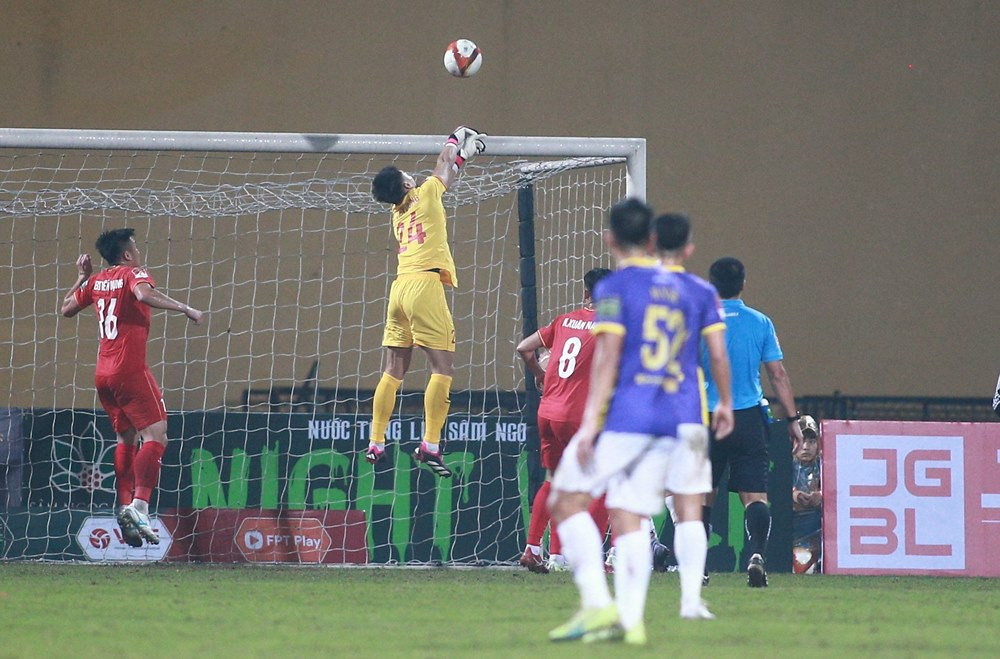 Đến lượt Thành Chung kết thúc sát vòng cấm, bóng khẽ chạm chân cầu thủ CAHN rồi "liếm" mép ngoài cột dọc khung thành thủ môn Bùi Tiến Dũng.