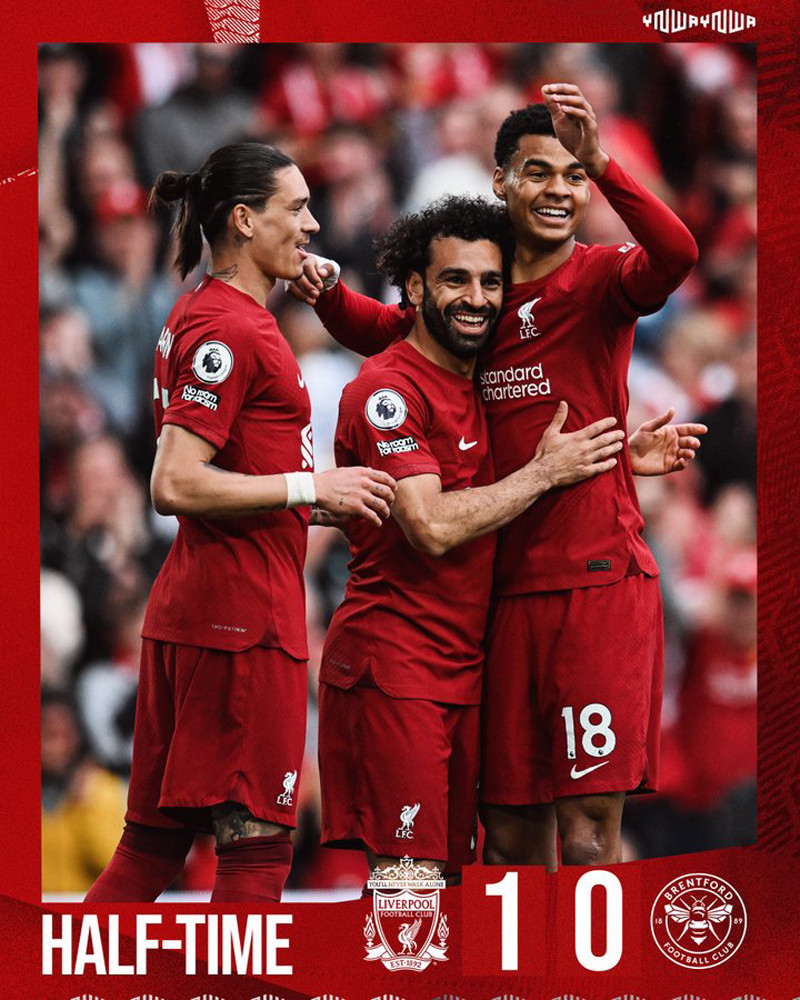 Salah tỉa bóng xuống cho Nunez kết thúc góp hẹp nhưng bị hậu vệ Brentford truy cản.