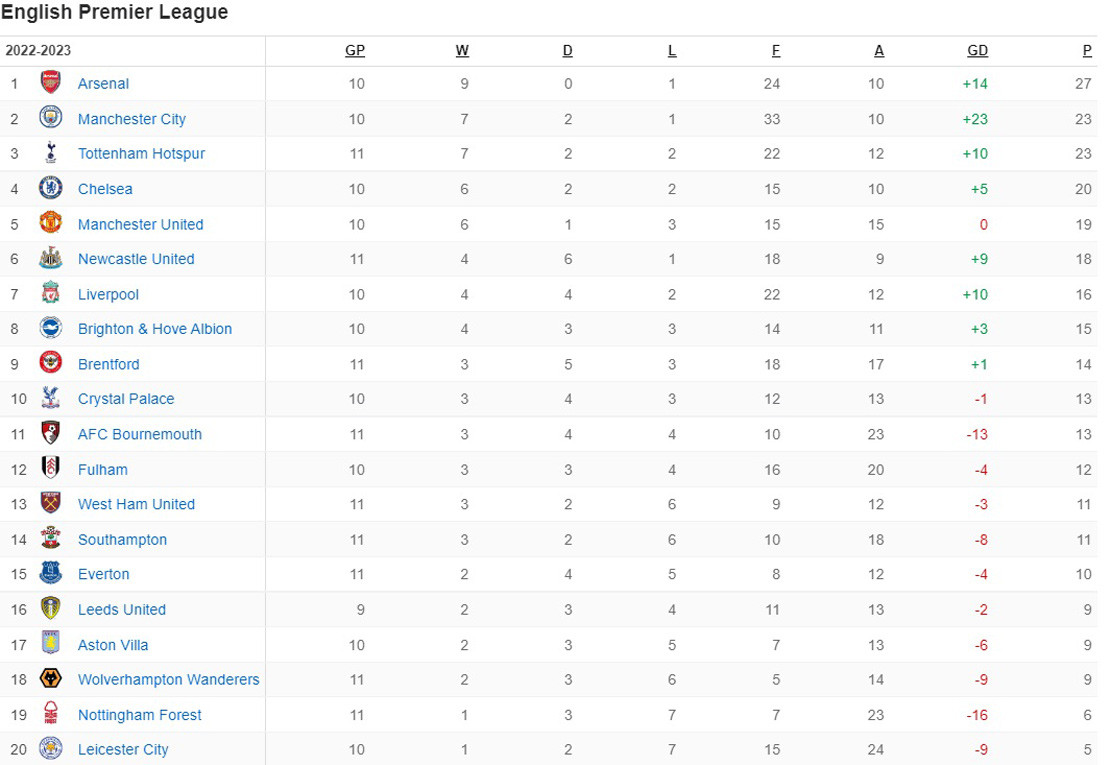 Bảng xếp hạng Ngoại hạng Anh vòng 12: MU thổi lửa vào cuộc đua vô địch Bảng xếp hạng bóng đá Ngoại hạng Anh 2022-2023 - Cập nhật liên tục bảng xếp hạng bóng đá Ngoại hạng Anh mùa giải 2022-2023 nhanh và chính xác nhất.