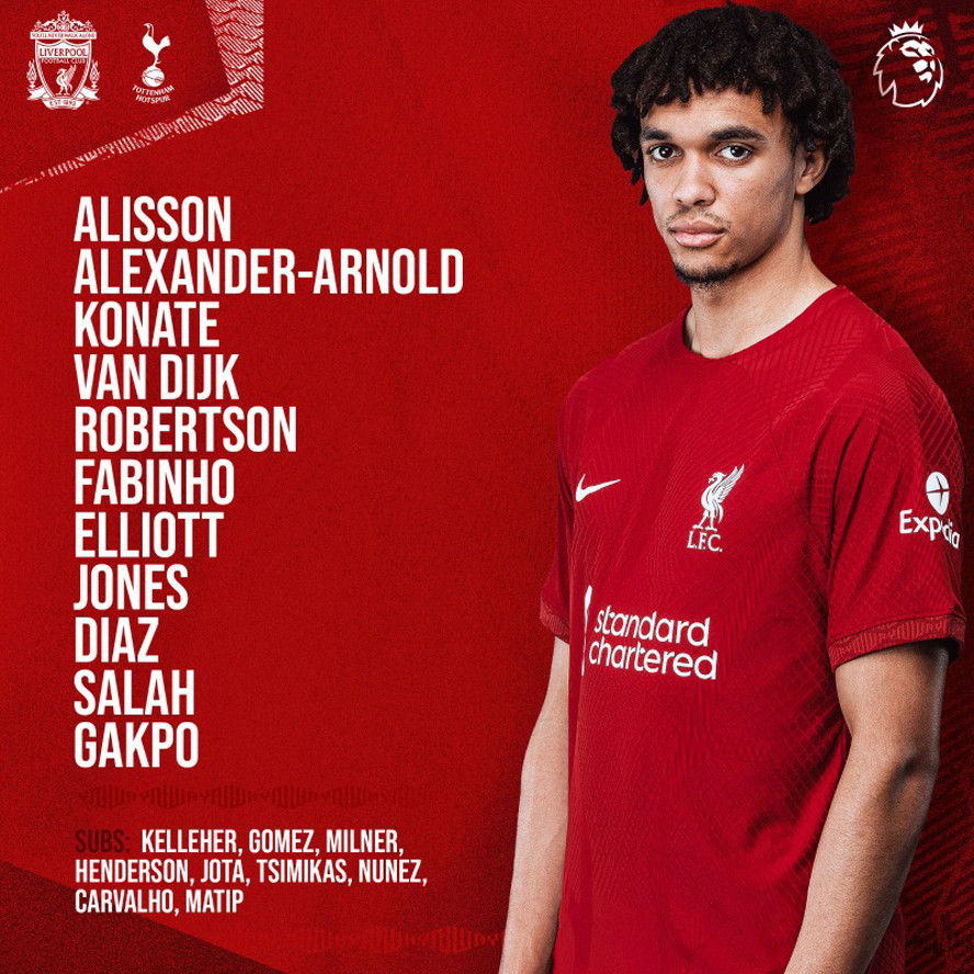 Liverpool: Alisson, Alexander-Arnold, Konate, Van Dijk, Robertson, Elliott, Fabinho, Jones, Salah, Gakpo, Diaz.