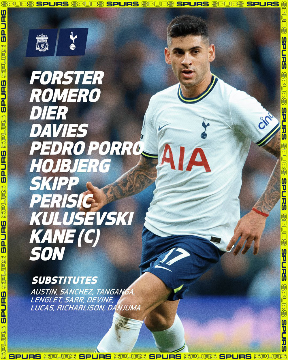 Tottenham: Forster, Romero, Dier, Davies, Porro, Hojbjerg, Skipp, Perisic, Kulusevski, Kane, Son.