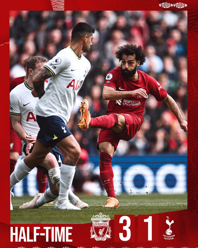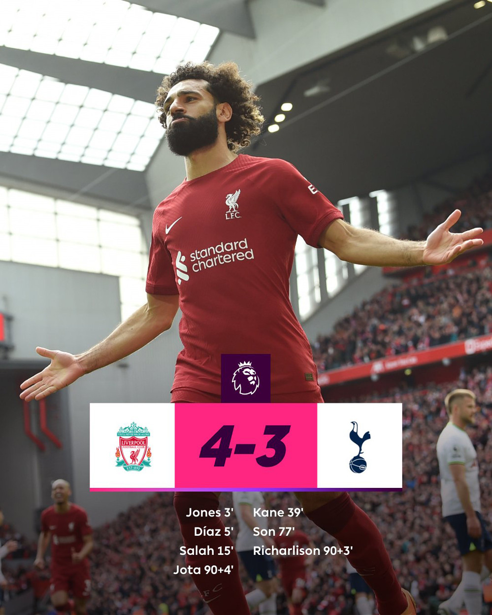 Bàn thắng: Jones 3', Diaz 5', Salah 15' (pen), Jota 90'+4 - Kane 40', Son 77', Richarlison 90'+3