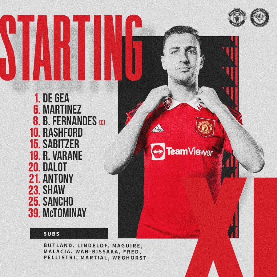 MU: De Gea; Dalot, Varane, Martinez, Shaw (Malacia 36'); Sabitzer, McTominay; Sancho, Fernandes, Rashford, Antony.