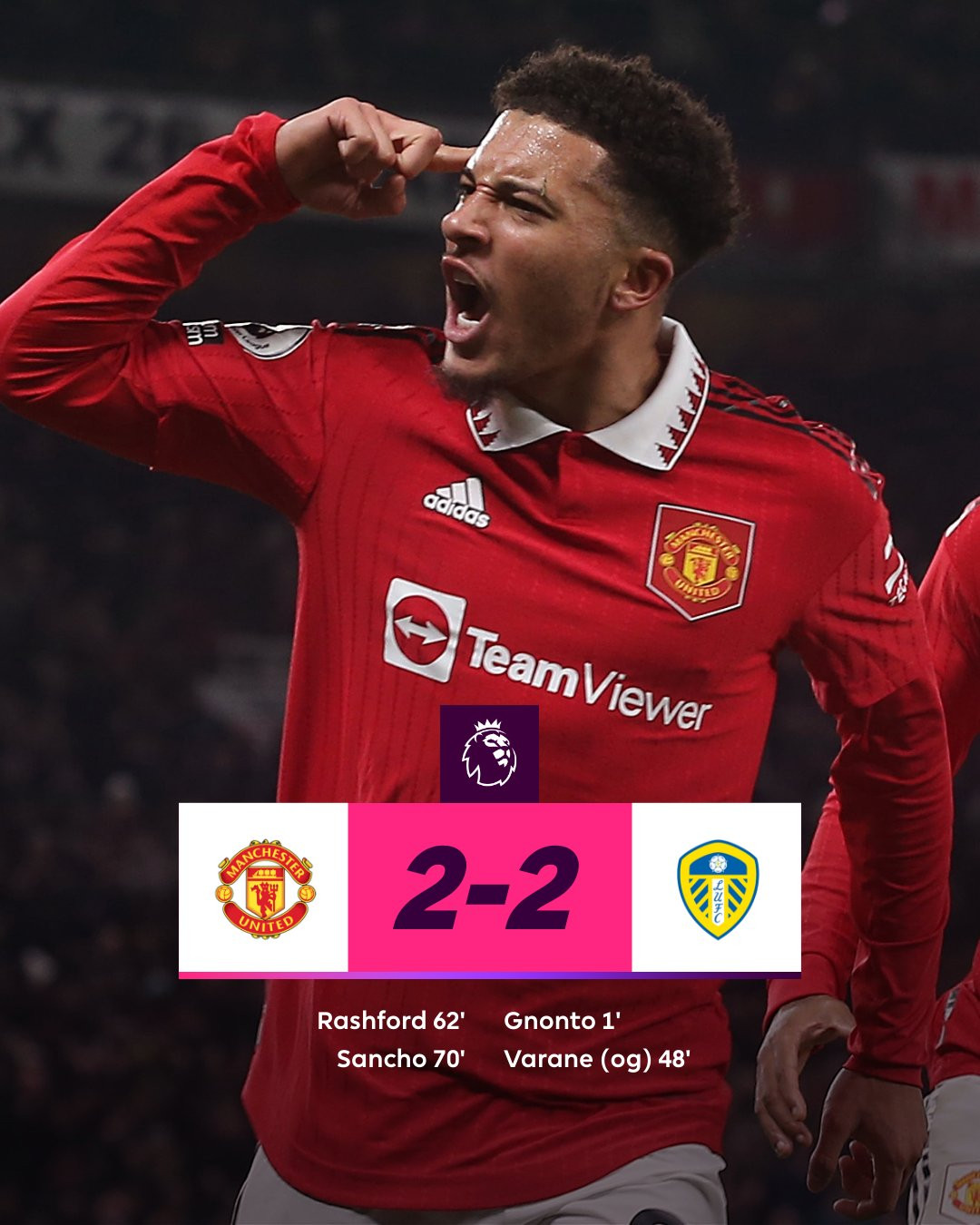 Bàn thắng (2-2, Jadon Sancho): Sau tình huống chồng biên trái, Jadon Sancho xử lý hay với cú cứa lòng chân phải đẳng cấp gỡ hòa 2-2 cho Quỷ đỏ.