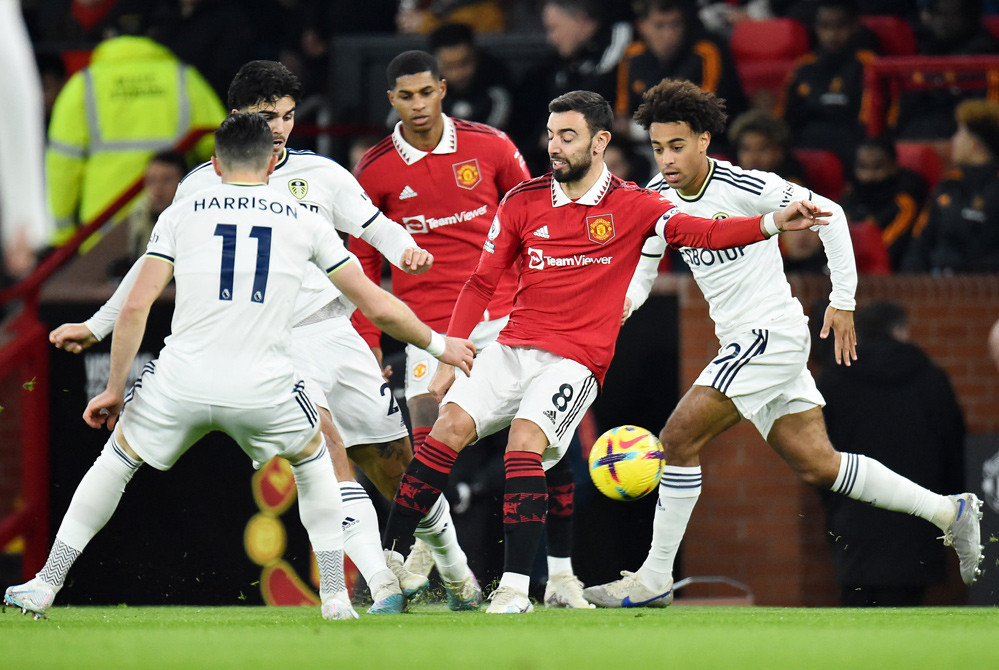 MU đang bị choáng ngợp trước lối đá pressing của Leeds. De Gea vừa phải cứu thua bằng 5 đầu ngón tay sau cú đánh đầu của Strujik.