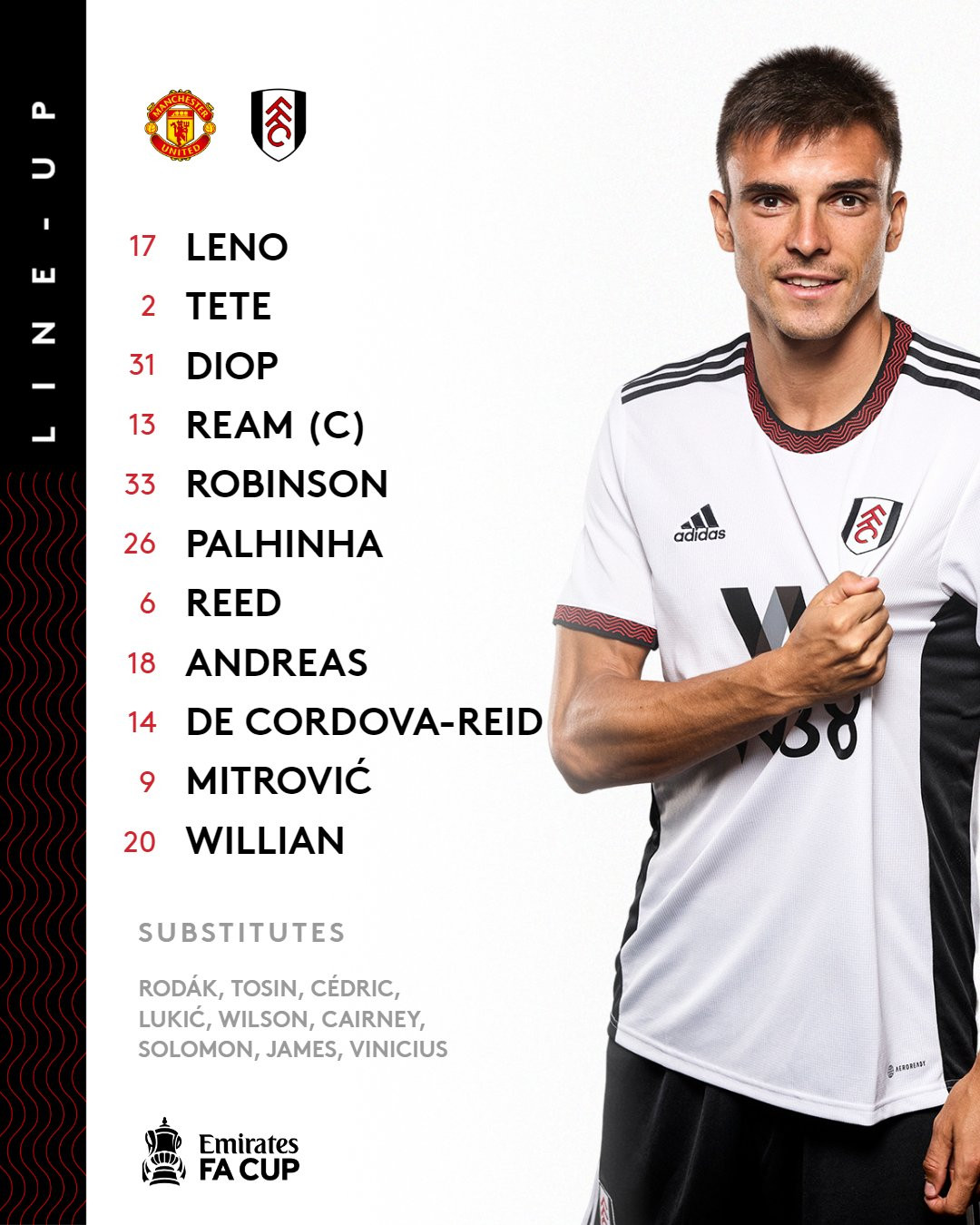 Fulham: Leno; Tete, Diop, Ream, Robinson; Palhinha, Reed; Willian, Pereira, Cordova-Reid; Mitrovic.
