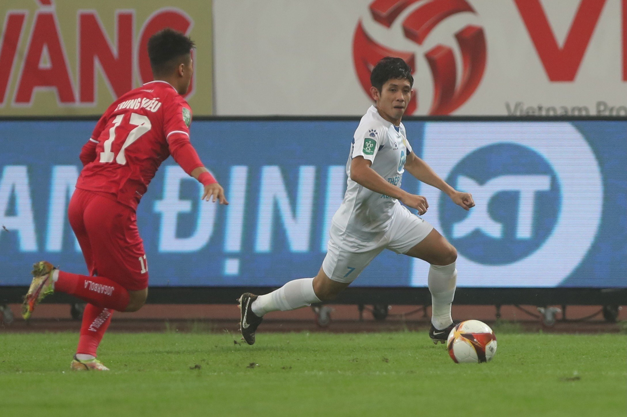 Hải Phòng được hưởng quả phạt bên ngoài vòng cấm, Lương Xuân Trường thực hiện cú sút đưa bóng đi không trúng đích.