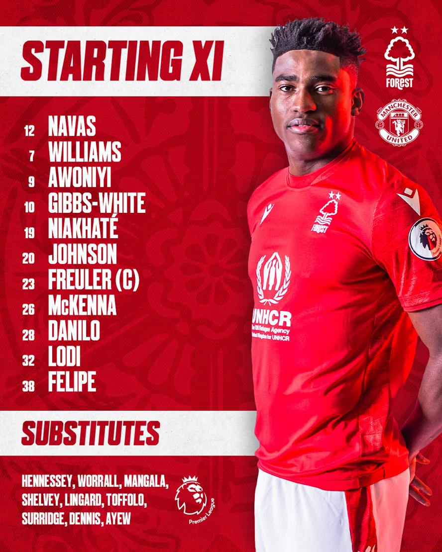 Nottingham Forest: Navas; McKenna, Williams, Felipe, Lodi; Freuler, Danilo, Niakhate; Gibbs-White, Johnson; Awoniyi.