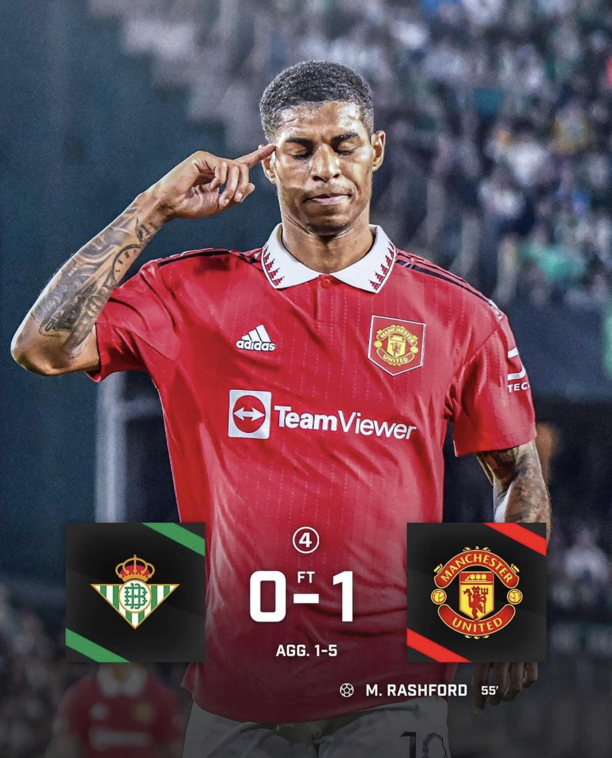Bàn thắng (0-1, Rashford): Có bóng ngoài trung lộ, Marcus Rashford tung ra cú đá mu lai má ngoài chân phải rất căng đưa bóng nằm gọn trong lưới Betis.
