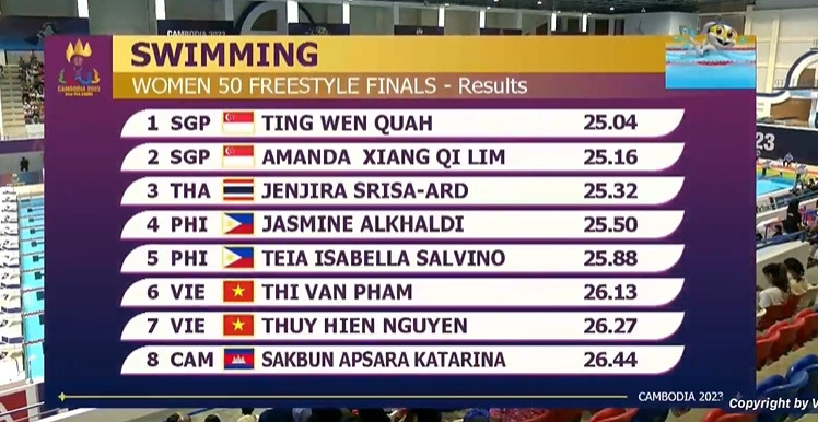 Kình ngư 13 tuổi Nguyễn Thúy Hiền về đích thứ 7, trong khi Phạm Thị Vân cán đích thứ 6 chung kết nội dung 50m tự do nữ. HCV thuộc vệ siêu kình ngư người Singapore Wuah Ting Wen về nhất với thời gian 25 giây 04.