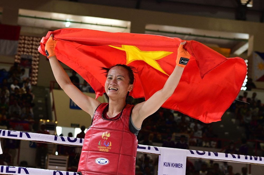 Nữ võ sĩ Tạ Thị Kim Yến đánh bại tay đấm người Myanmar trong trận chung kết hạng cân 48k để giành HCV thứ 2 cho ĐT Kun Khmer.