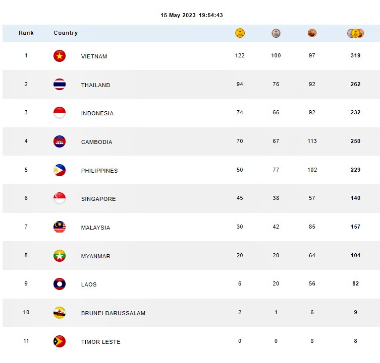 Bảng tổng sắp huy chương SEA Games 32 ngày 15/5