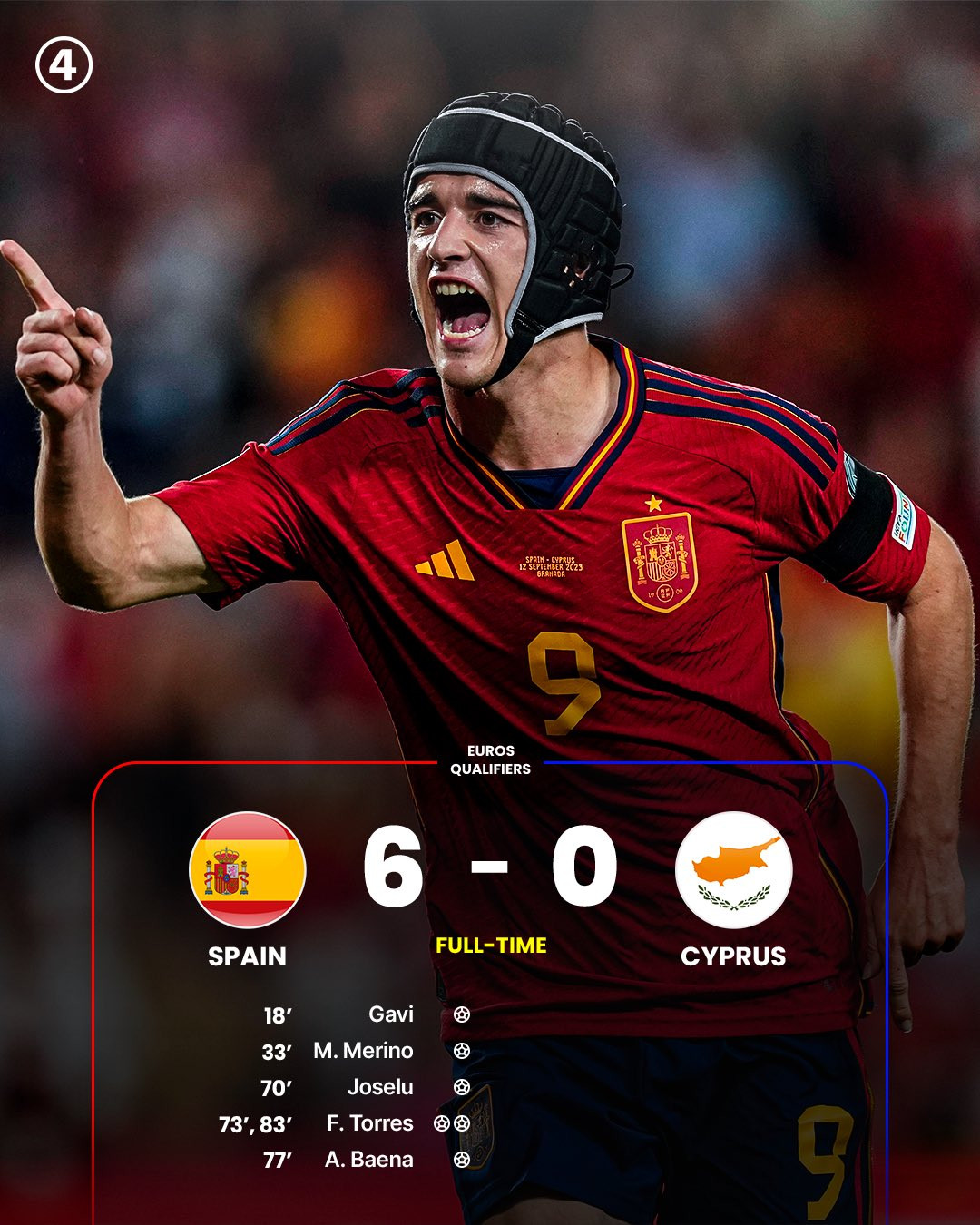 Tây Ban Nha áp đảo sau tiếng còi khai cuộcGavi nhanh chóng mở tỷ số cho "những chú bò tót"Niềm vui của tiền vệ trẻ thuộc biên chế BarcelonaJoselu ghi bàn thứ 3 cho Tây Ban NhaTây Ban Nha giành chiến thắng đậm đàKết quả các trận vòng loại Euro 2024 rạng sáng 13/9