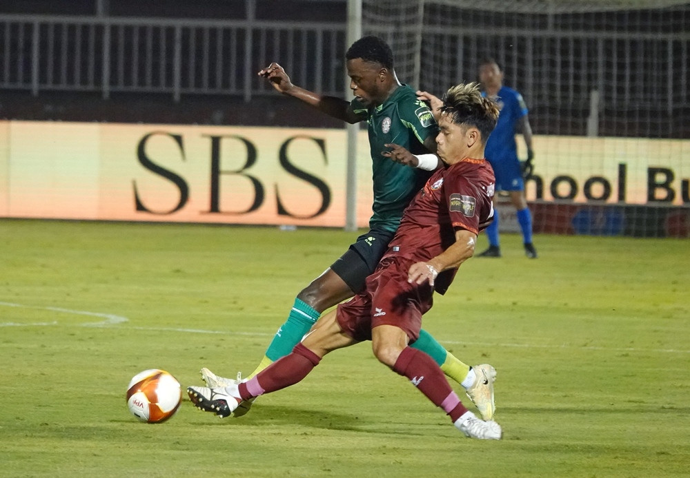 Đón bóng từ quả tạt của đồng đội bên cánh phải, Jermie Lynch bật cao đánh đầu đưa bóng đi sát sạt cột dọc khung thành TPHCM.